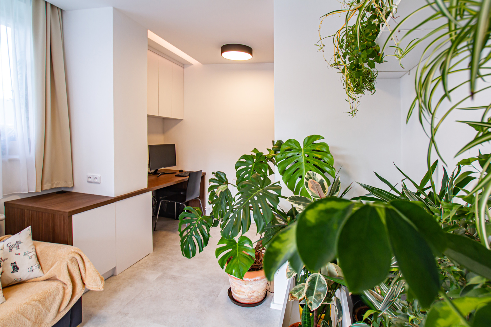 Pracovna je oázou rostlin. Vytvořili jsme velký tříúrovňový nábytek pro rostliny. Do jednotlivých sekci se jednoduše umisťují květináče. Rostlinstvo tak ale získá jednotný vzhled a dělá dojem vegetační stěny. Chtěli jsme tímto rostlinám dát svůj vlastní prostor místo toho, aby byly umístěné nevzhledně na parapetech oken a rušili pohled na okna.