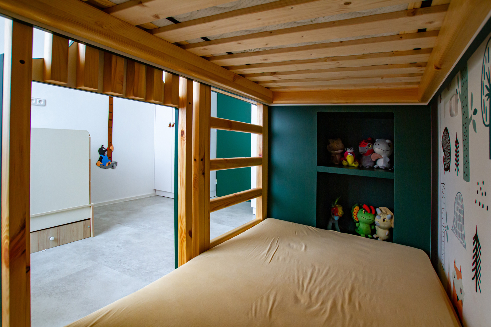 Třešničkou na dortu se stal dětský pokojík, který si Maruška takřka vysnila. Zadání bylo jasné, chtěla dětsky stylizovaný domeček, ve kterém by mohli spát oba kluci a umožňoval i výsuv pro přistýlku, pro malého hosta. Naše první návrhy jednoduchých domečků neobstály, až na druhý pokus jsme vytvořili domek z latí, ve kterém jsou průlezy inspirované jihočeským selským barokem, které jsou pro nás, jihozápadočešky, klasikou. Nesměl chybět ani komín a ozdobná římsa.