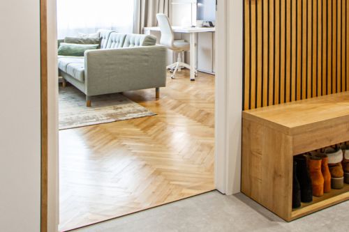 Vzhledem k nižšímu rozpočtu realizace jsme museli stavební práce omezit na minimum a soustředit se hlavně na vybavení nábytkem. V bytě byla upravena část elektrických rozvodů, byla vyměněna nášlapná vrstva podlah v zádveří a v kuchyni a opravena stávající masivní dřevěná podlaha v obývacím pokoji a ložnici.