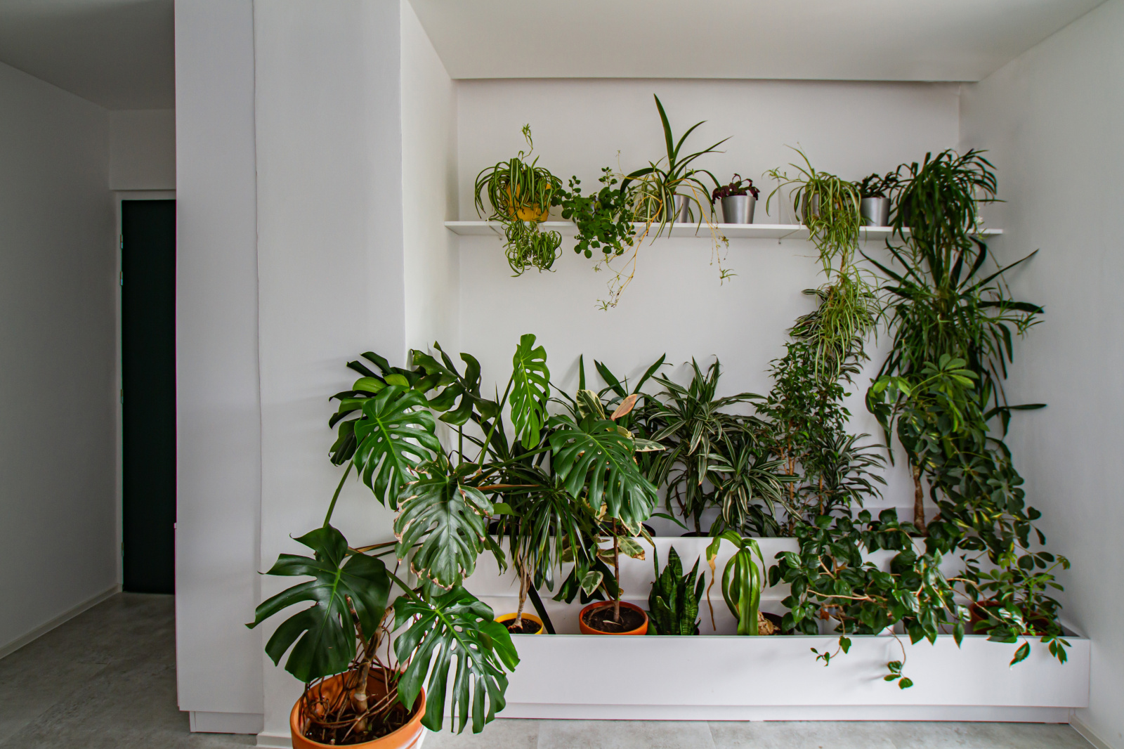 Pracovna je oázou rostlin. Vytvořili jsme velký tříúrovňový nábytek pro rostliny. Do jednotlivých sekci se jednoduše umisťují květináče. Rostlinstvo tak ale získá jednotný vzhled a dělá dojem vegetační stěny. Chtěli jsme tímto rostlinám dát svůj vlastní prostor místo toho, aby byly umístěné nevzhledně na parapetech oken a rušili pohled na okna.