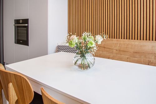 Důležitým motivem interiéru se staly dubové latě, kterými jsme obložili stěny v zádveří a kuchyni. V zádveří byla ponechána původní vestavěná skříň, které jsme vyměnili dveře. Další nábytek už byl řešen na míru vestavbou z bílého lamina a z lamina imitujícího dubové dřevo. Kuchyně byla původně navržena ze systému z obchodního domu Ikea, nicméně nakonec se výroby chopili truhláři, kteří pak vytvořili i nábytek na míru v obývacím pokoji.